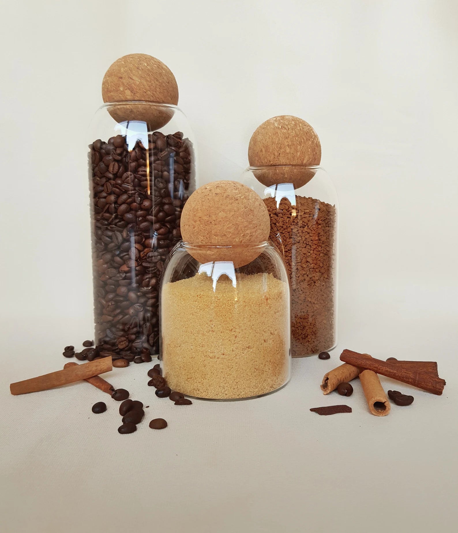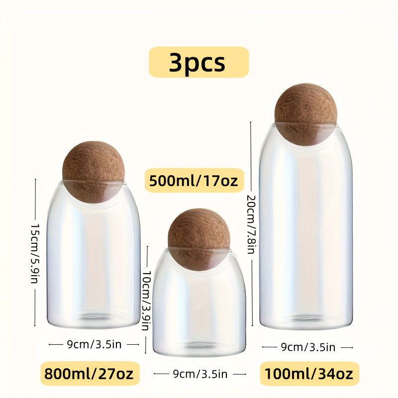 Set van 3 glazen opbergpotten met kurkdeksels.