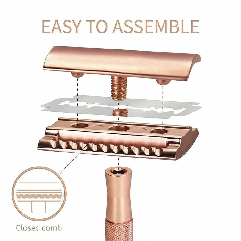 Deze roségouden safety razor is een echte eyecatcher in je badkamer. Gemaakt van mat RVS met een elegante afwerking. Inclusief houder en 20 mesjes voor langdurig gebruik.